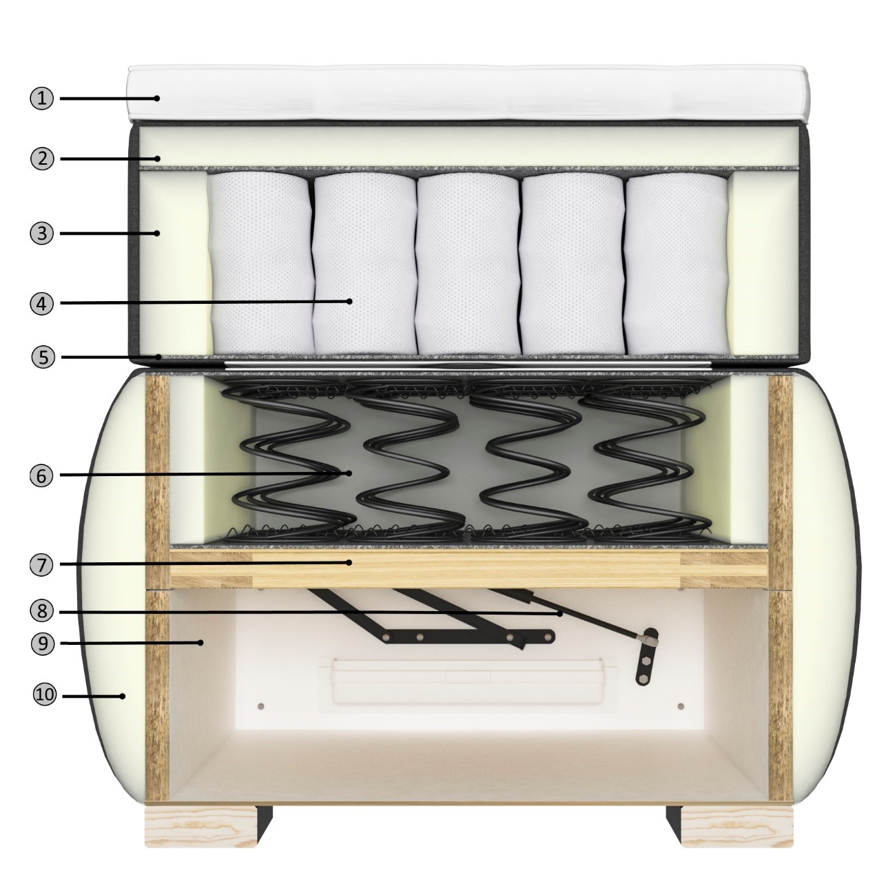1.Топпер (ППУ товщиною 40мм) 2.Лист ППУ товщиною 30мм 3.Обклади з ППУ по периметру матраца 4.Пружинний блок Pocket Spring 5.Настил з повсті 6.Пружинний блок Bonnel 7.Рама з бруса хвойних порід 8. Газовий амортизатор 9.Короб із ОДСП білого кольору 10.Контурна деталь із ППУ |